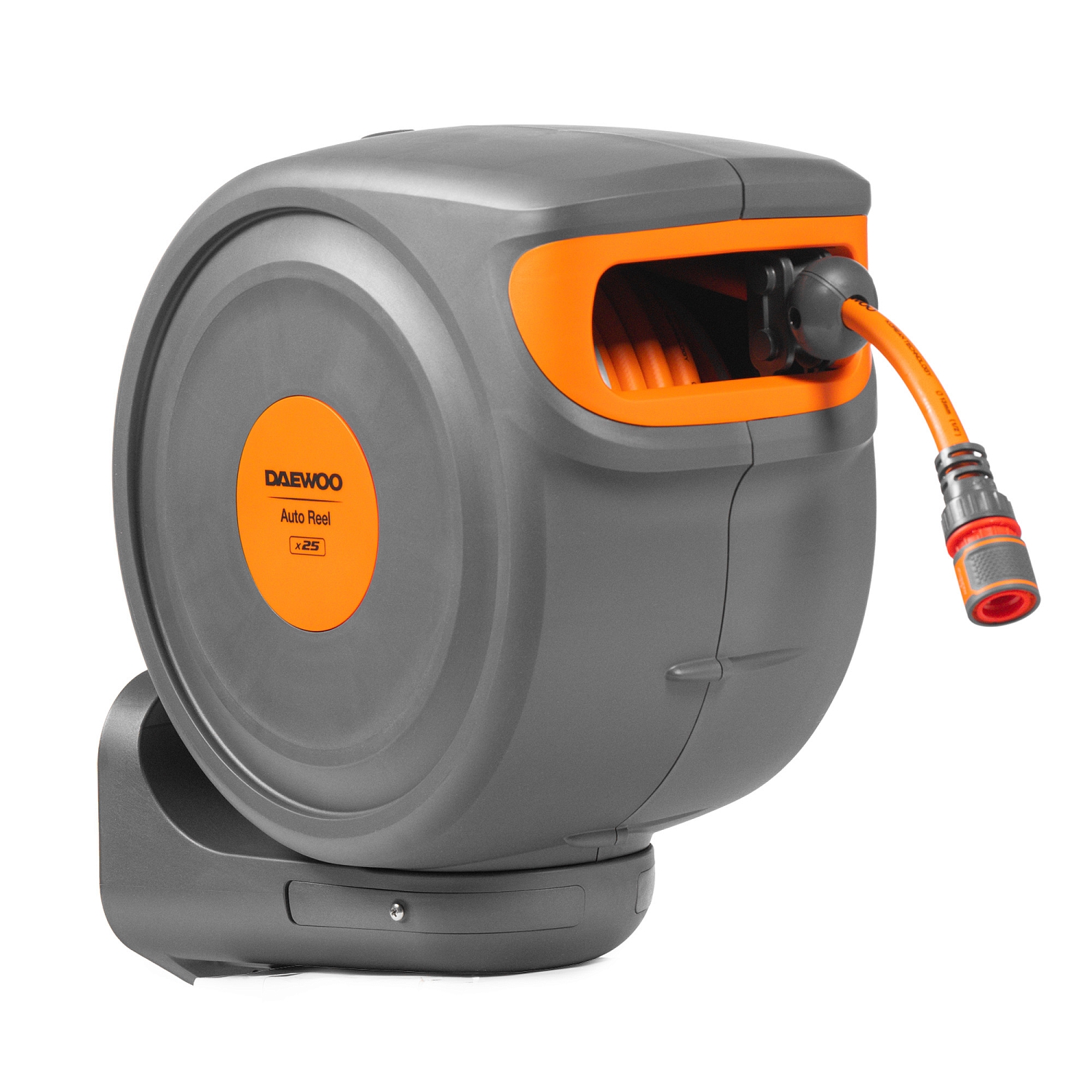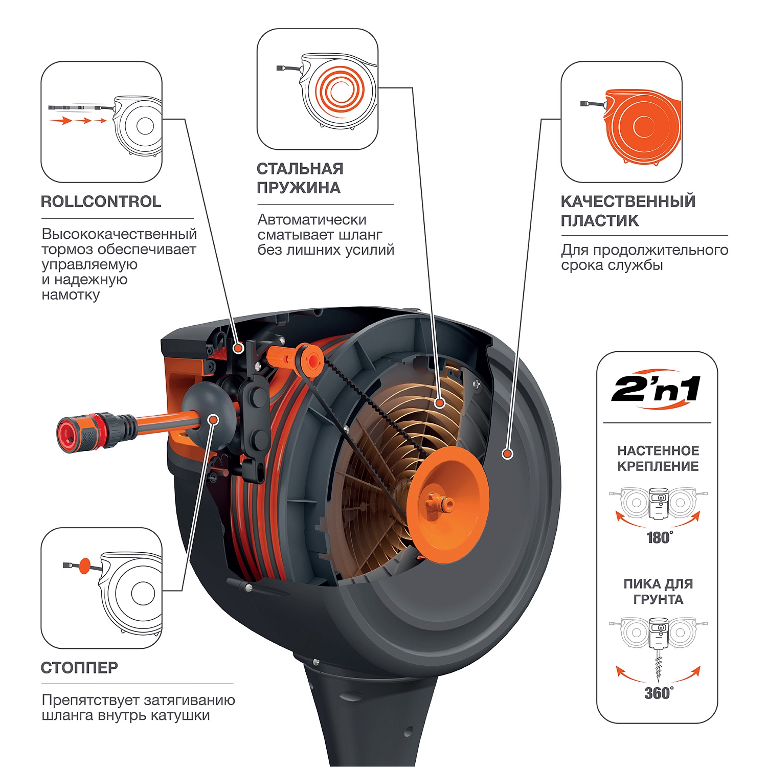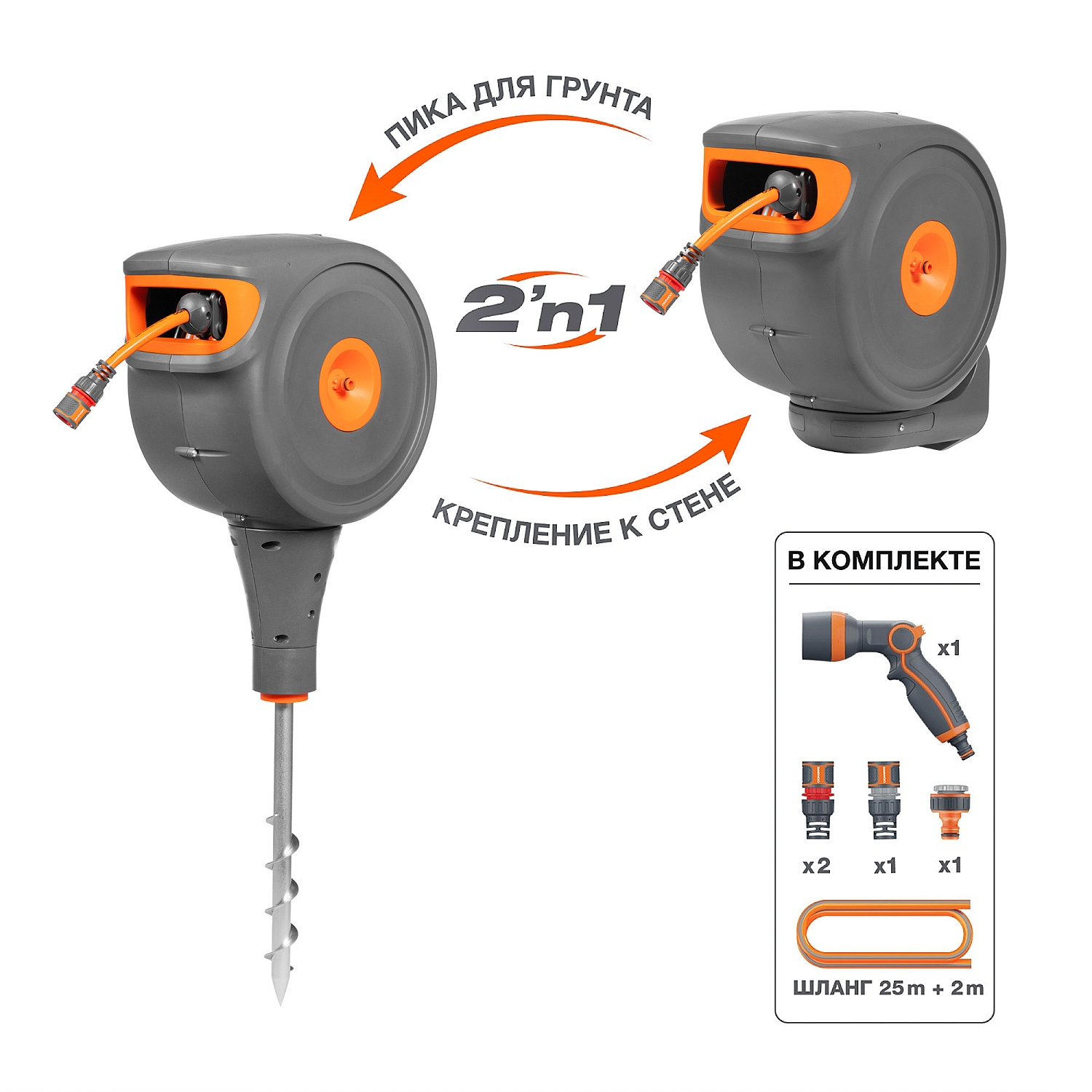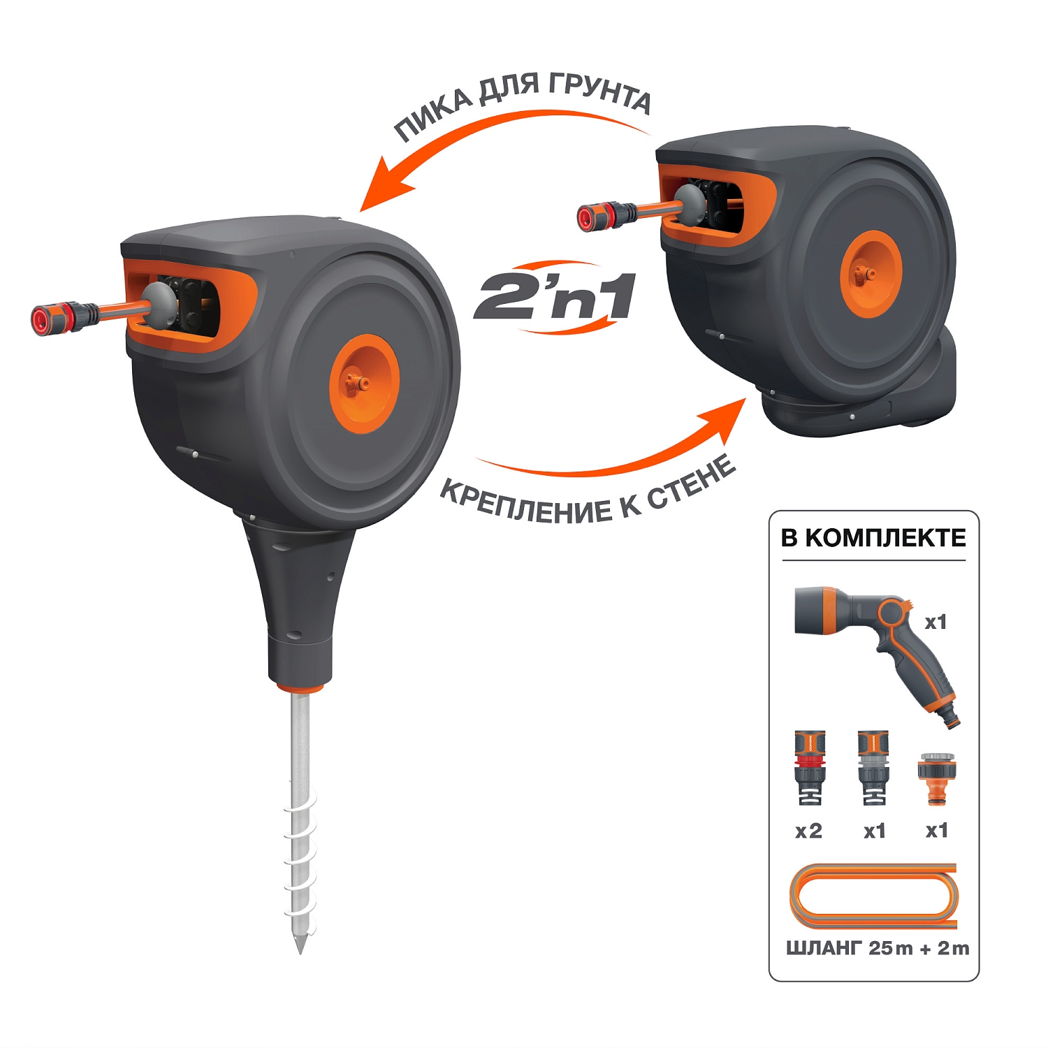 - 25м шланга позволяют использовать катушка на участках от 150 до 500 м2.