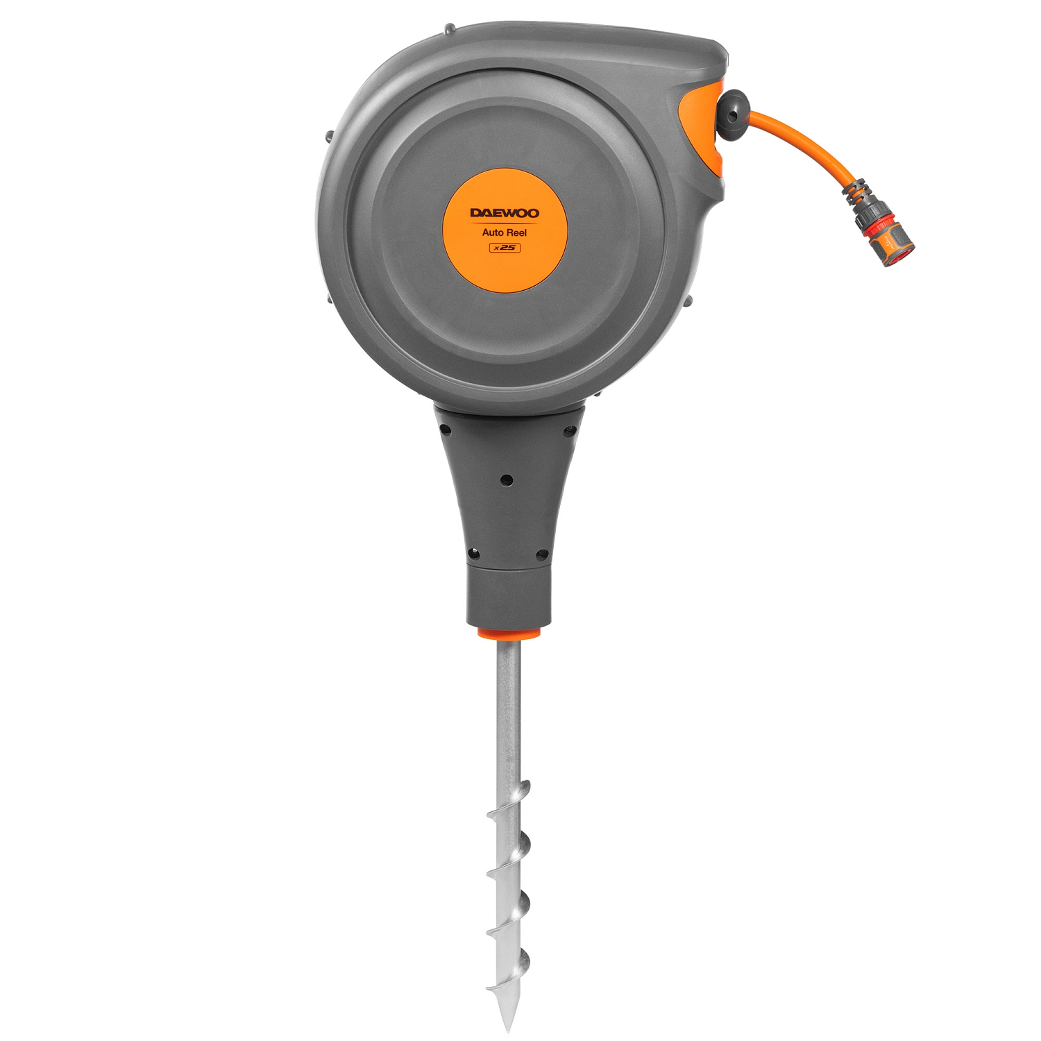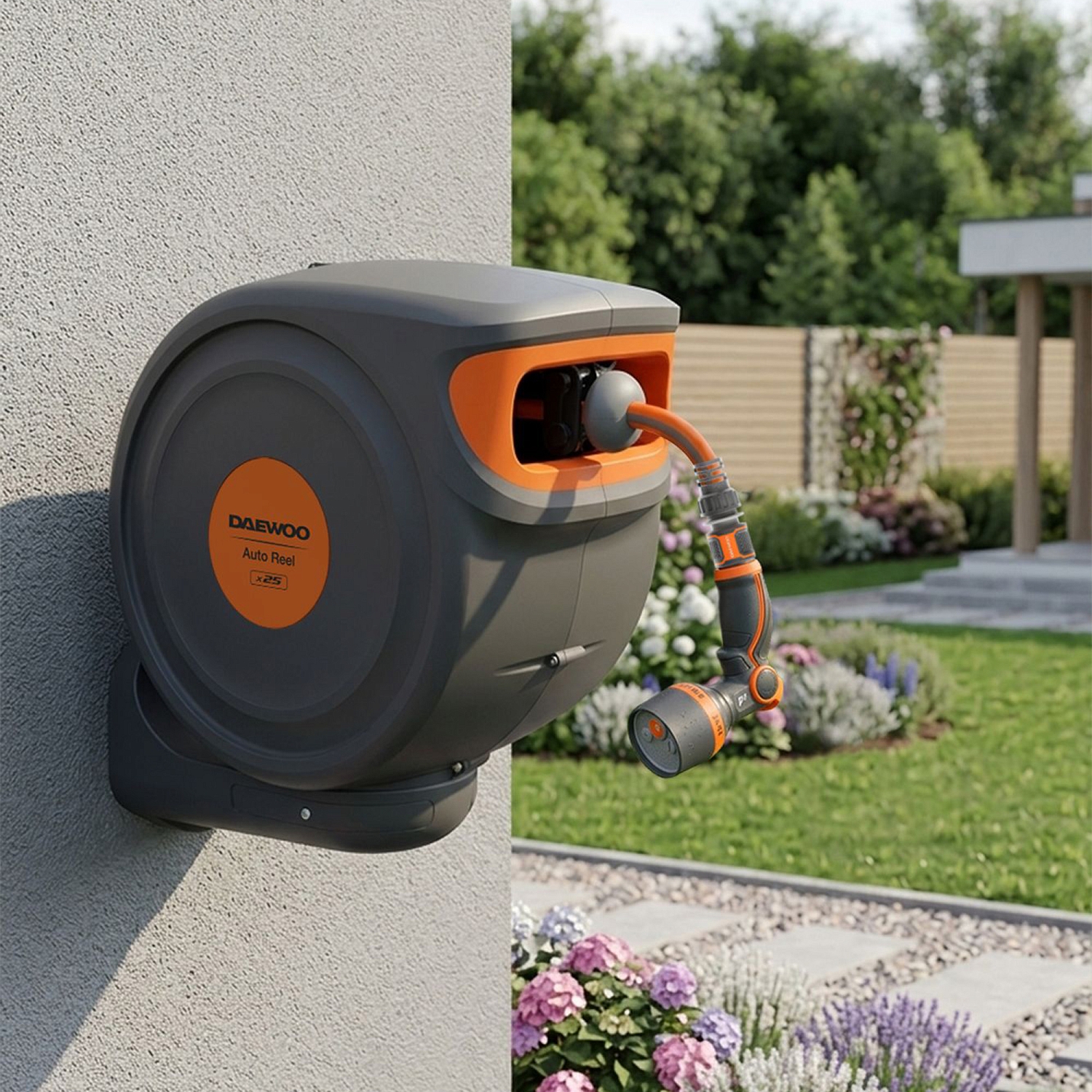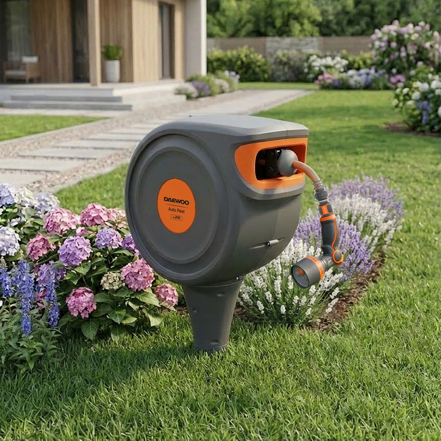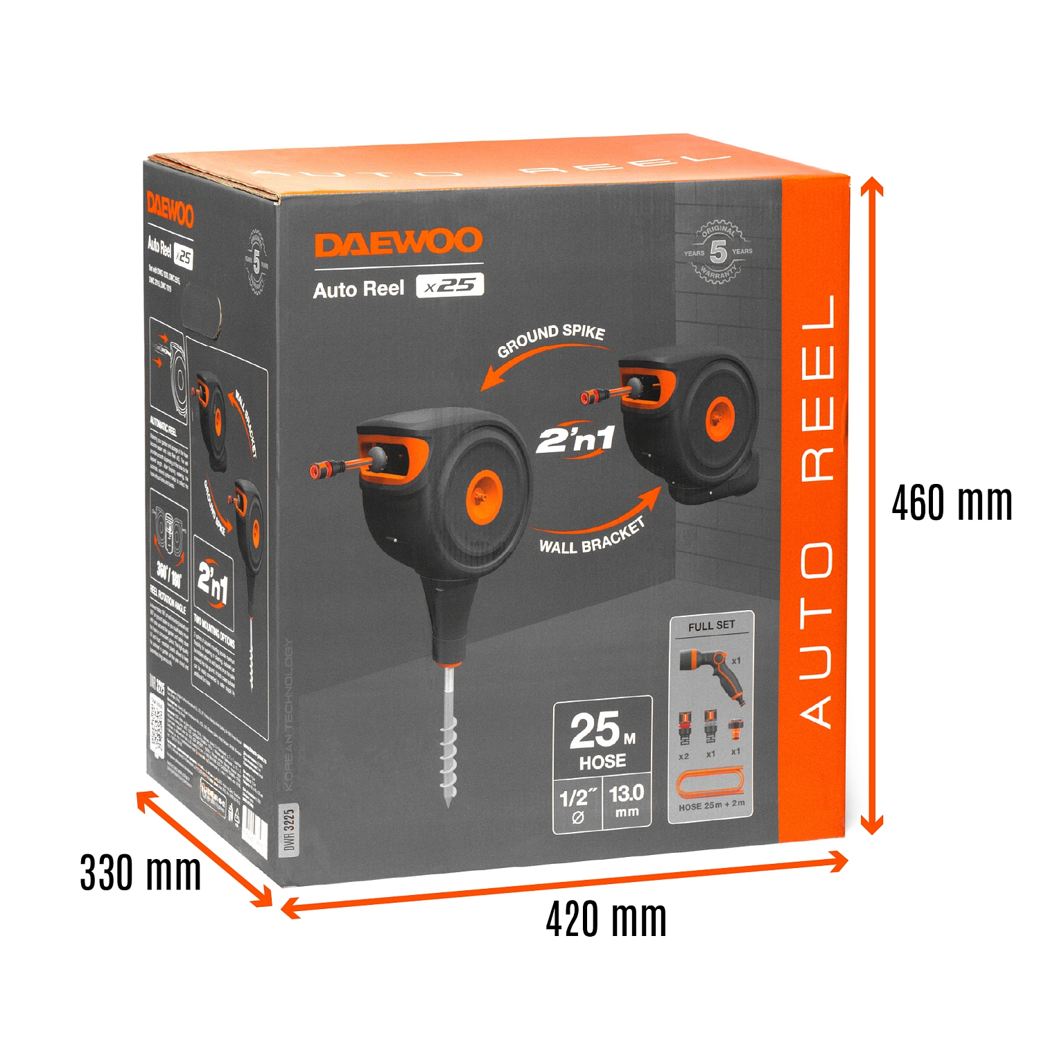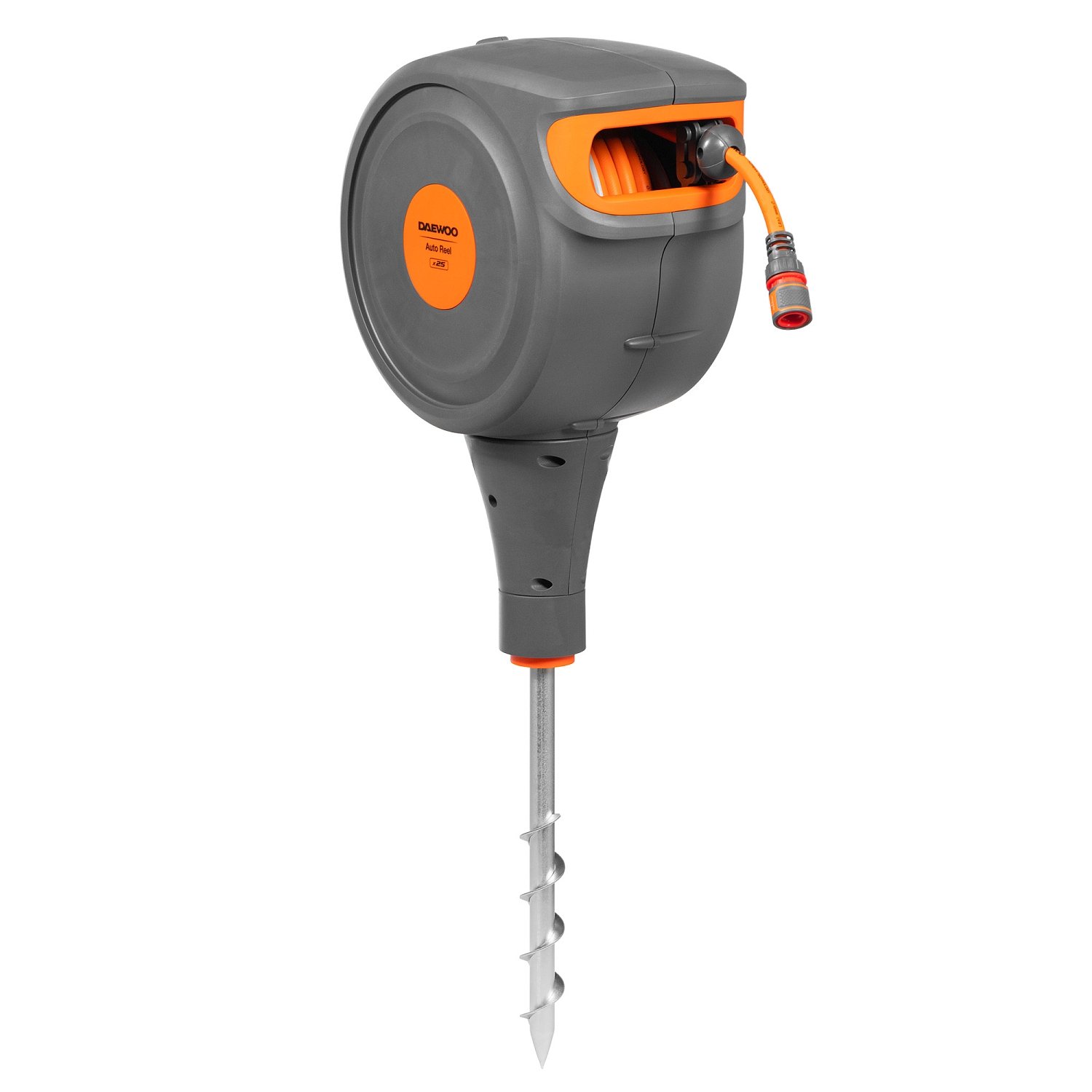 - 25м шланга позволяют использовать катушка на участках от 150 до 500 м2.