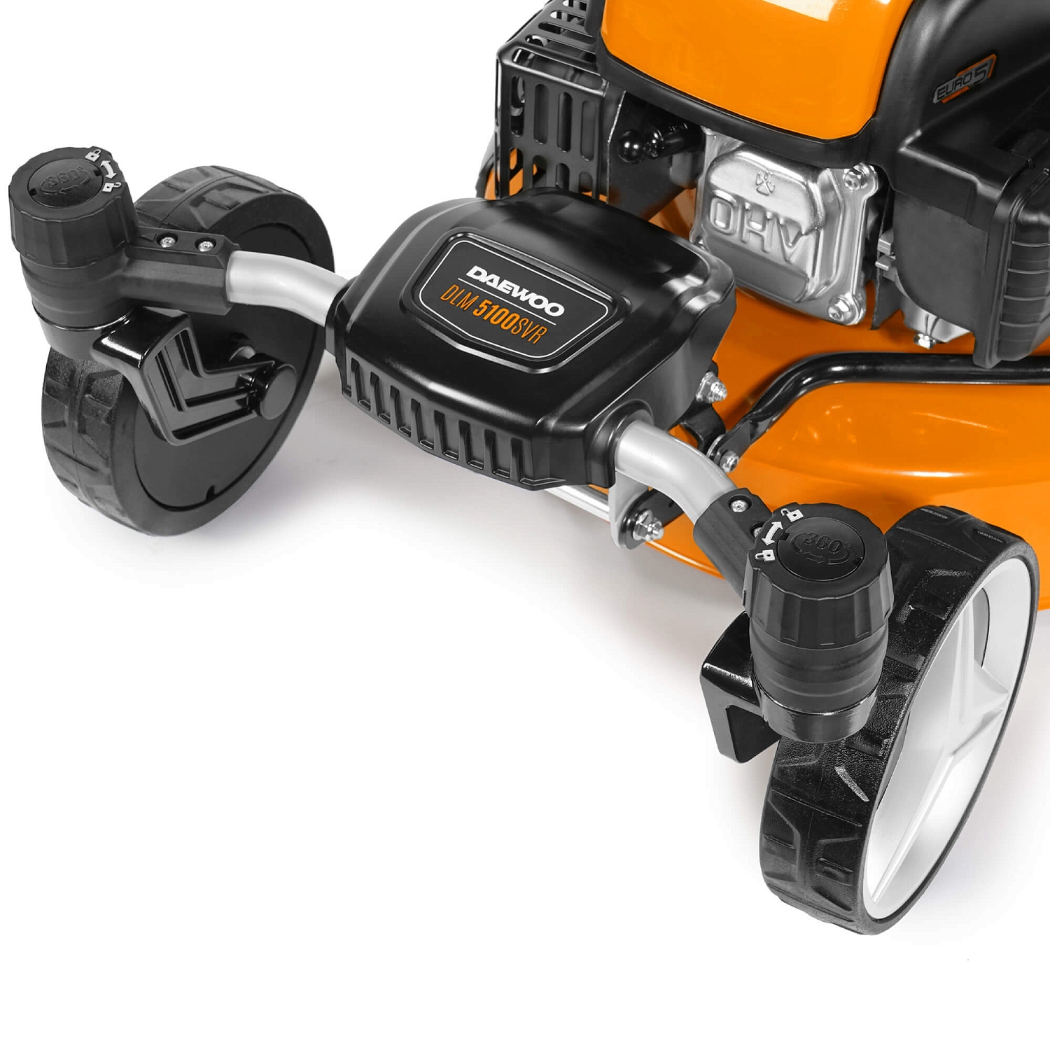 Настройка режущей деки производится в одно движение - путем смещения удобно расположенного рычага, который одновременно изменяет высоту подъема передних и задних колес.