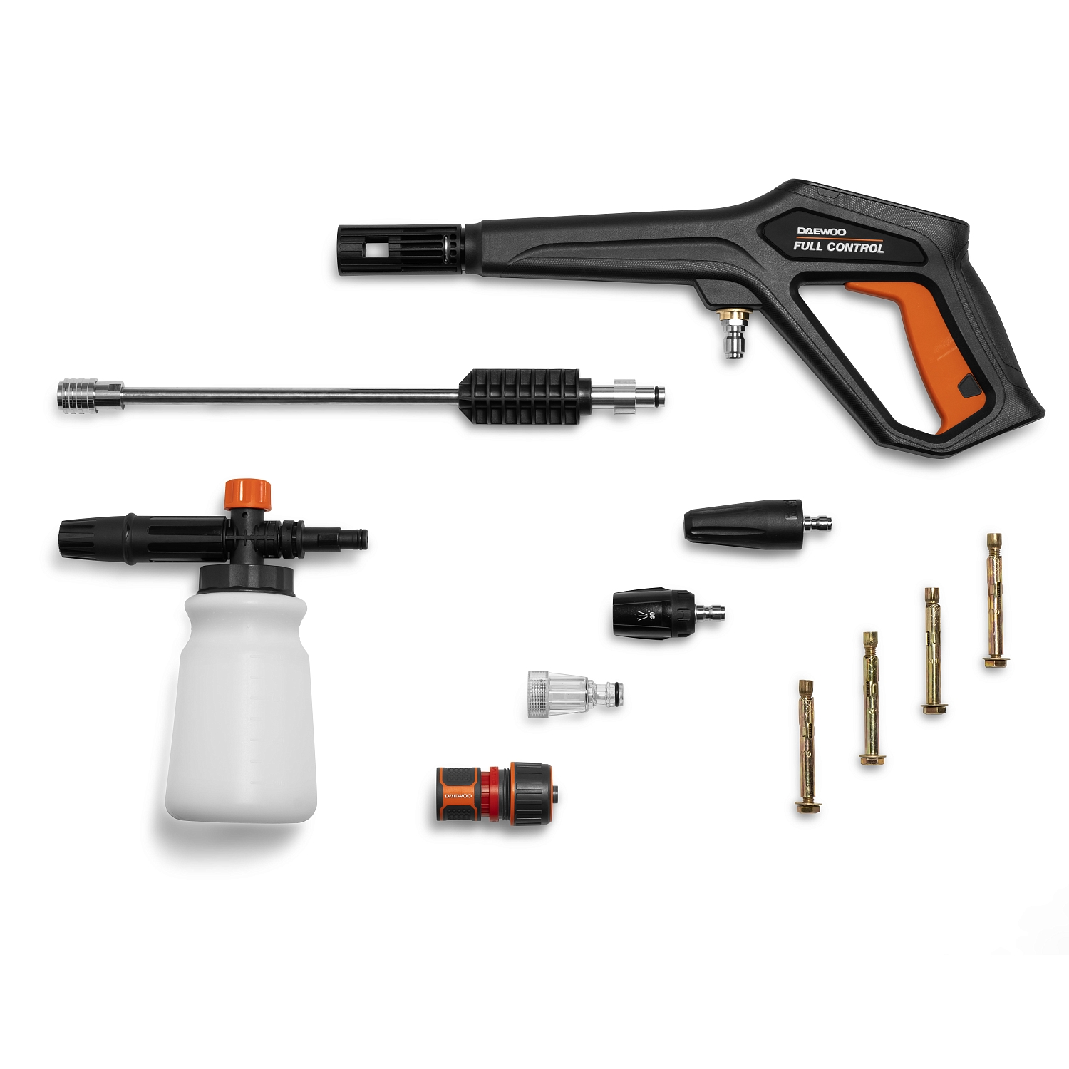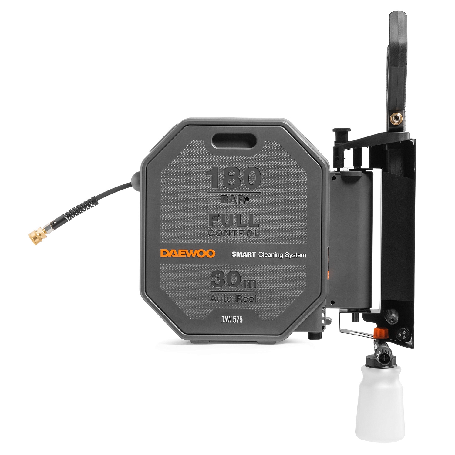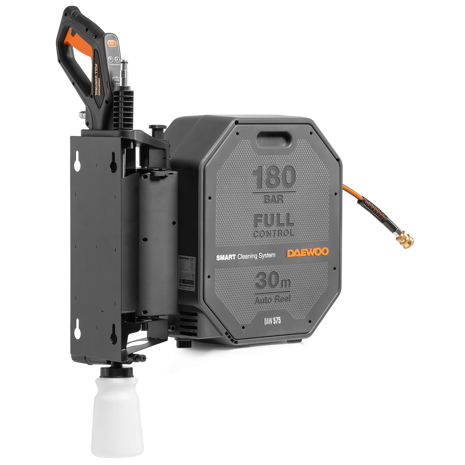 В комплект поставки входят шланг высокого давления длиной 30м, пистолет DAEWOO FULL CONTROL, моющая насадка 3-в-1 (15/25/40), грязевая фреза, входной фильтр, коннектор для садового шланга с аквастопом, поворотный кронштейн для установки на стену.