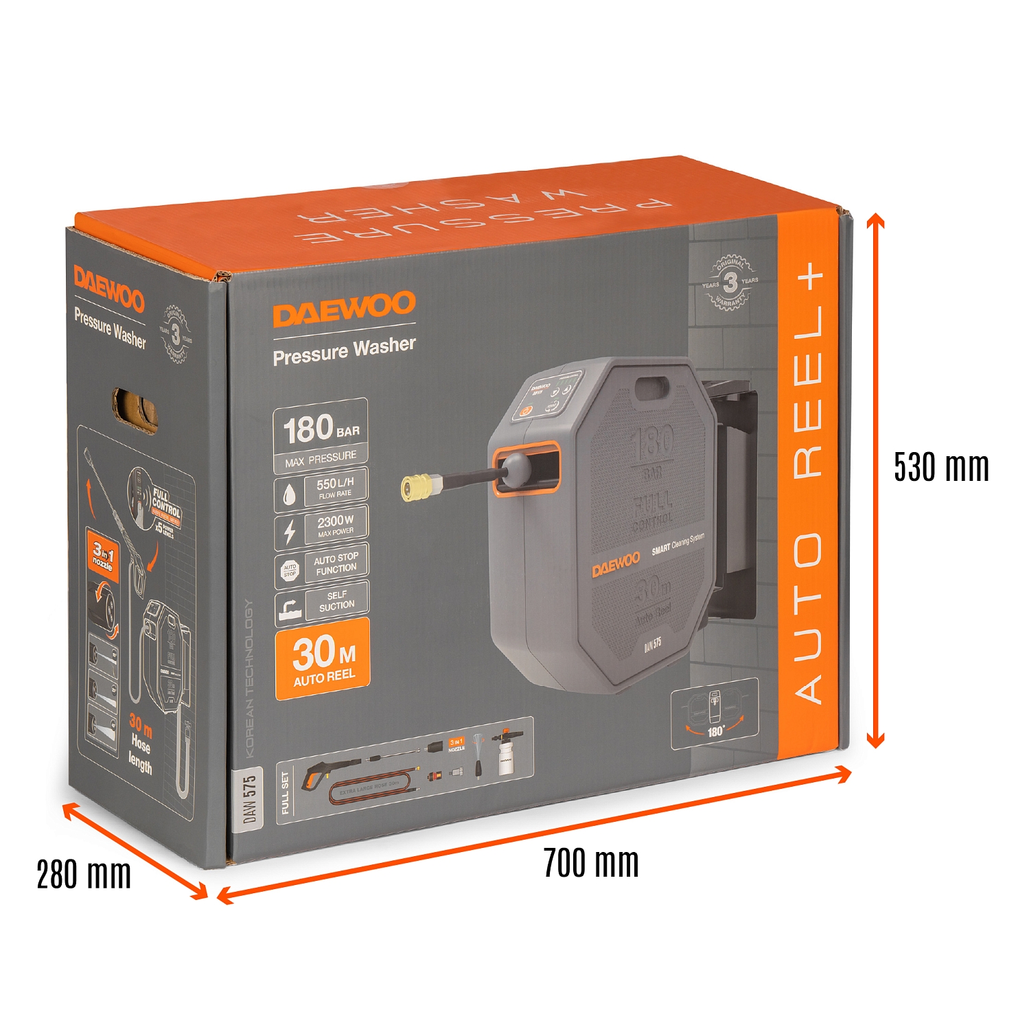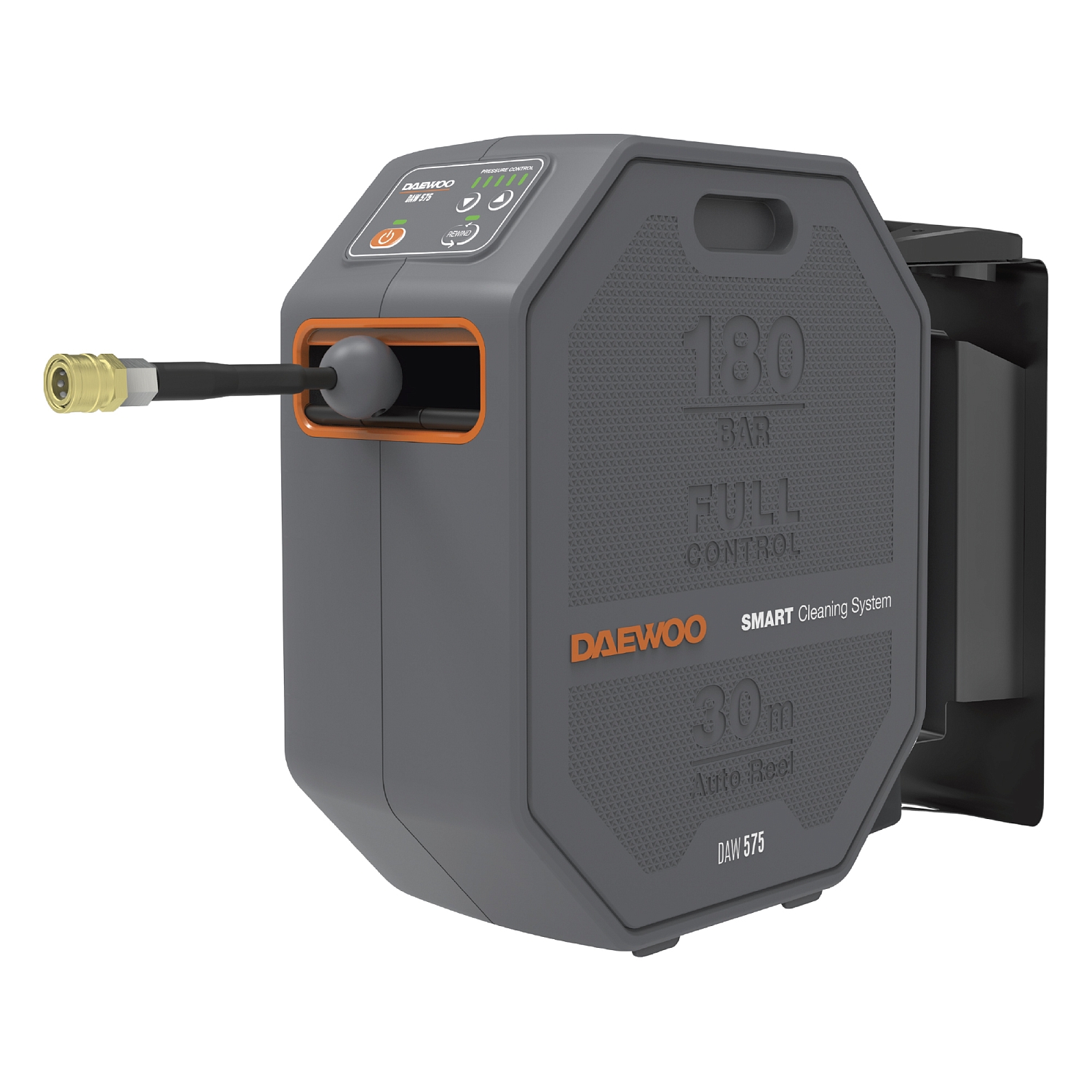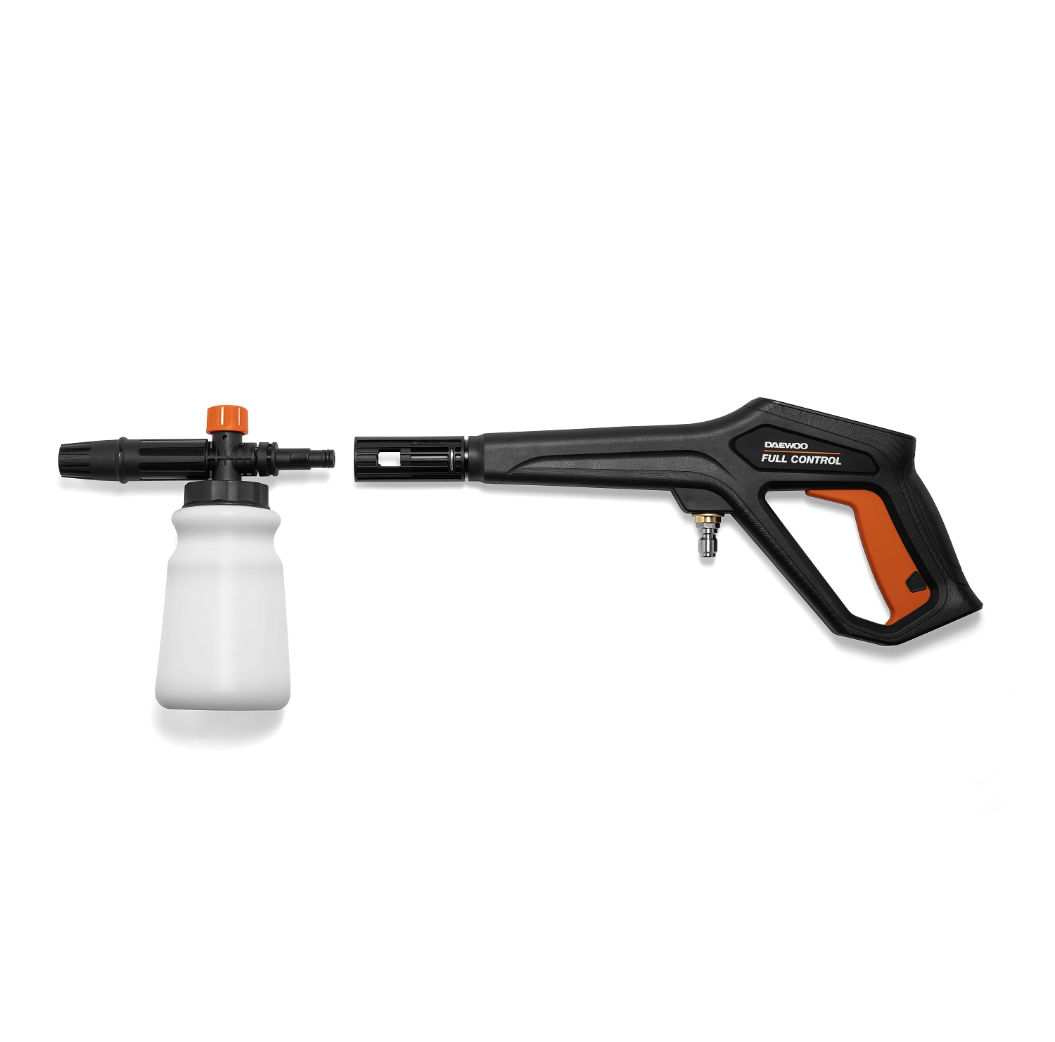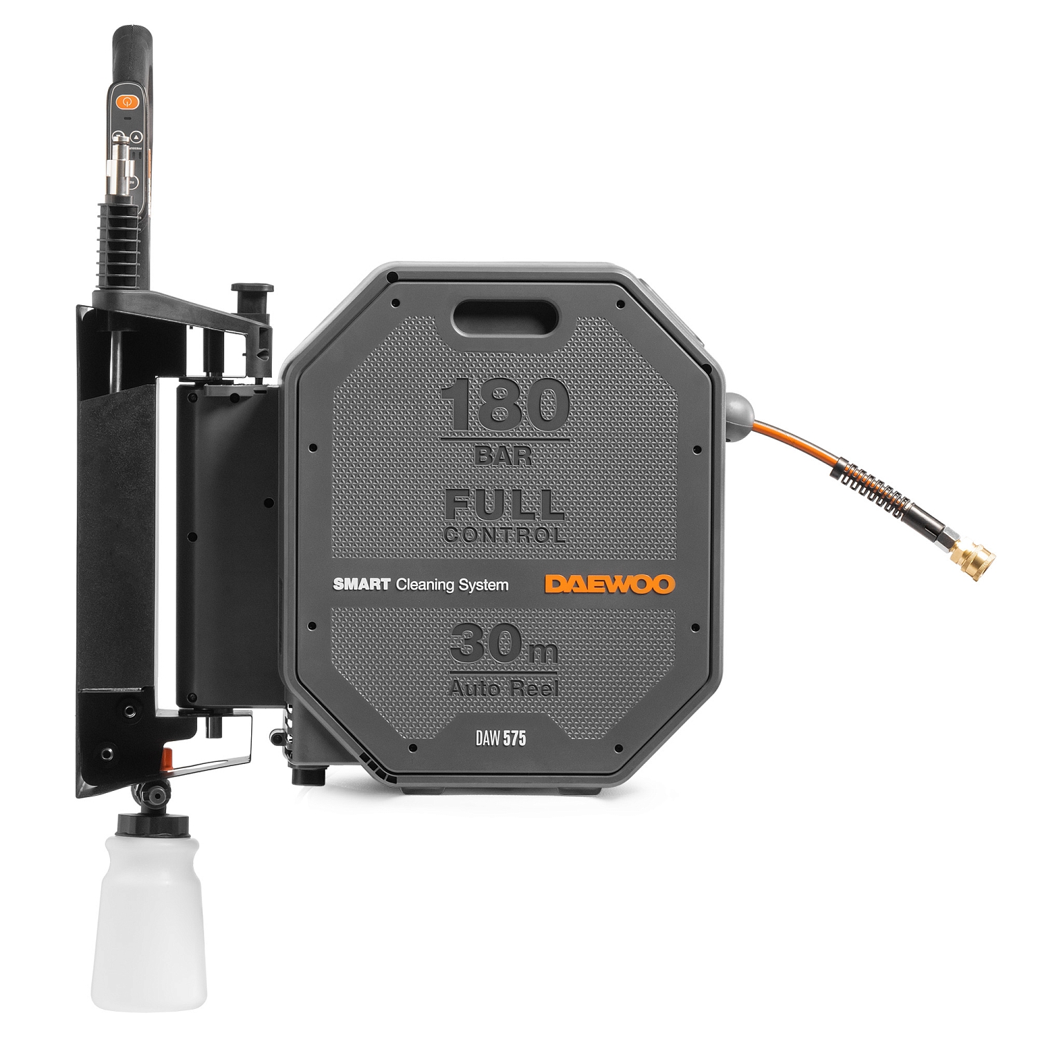В комплект поставки входят шланг высокого давления длиной 30м, пистолет DAEWOO FULL CONTROL, моющая насадка 3-в-1 (15/25/40), грязевая фреза, входной фильтр, коннектор для садового шланга с аквастопом, поворотный кронштейн для установки на стену.